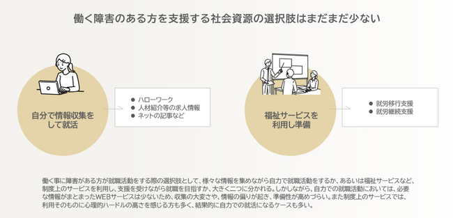 「自力での就職活動」においては、“障害がある方向けに必要な情報が集約されたWEBサービスが少ない”、“収集が大変”、“求人のみの情報が多い”などの声も聞かれます。福祉サービスなどの「制度上のサービス」では9割程度の方が無料で利用ができる反面、手続きや利用期間に多くの時間を要し、その間は基本的に無収入となる経済的負担と、サービス利用の心理的ハードルがあるなど、二つの選択肢それぞれに課題が存在します。