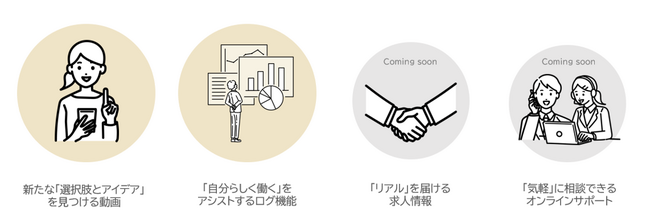 動画、ログ機能、の大きく2つの機能で構成され、障害を持つ当事者向けコンテンツを中心に、将来的には動画の強みを活かした求人情報やオンラインでのサポート機能、企業向けコンテンツなどの拡充もしていきます。
