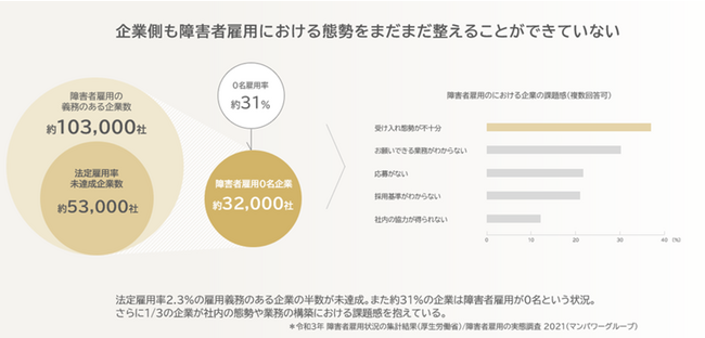 また、企業側も障害者雇用における体制・態勢を十分に整えることができない状況もあり、課題感を抱えていることが調査データからも伺えます。