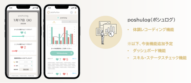 サービス開発にあたり、障害がある当事者へのアンケートで、就労後のニーズとして多くの声があった体調管理ツール(通称:poshulog/ポシュログ)を搭載します。毎日のログインごとに「からだの調子」「こころの調子」「睡眠時間」などを記録して可視化することができ、俯瞰してご自身の体調をチェックできます。また、動画の視聴状況がわかるダッシュボード機能や、求人へのエントリー書類作成に使えるスキルチェック機能なども今後提供を予定しています。