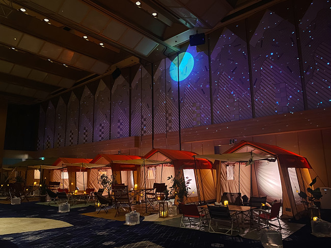 本企画では、アウトドア用品メーカー「テンマクデザイン」によるテントやテーブル、チェアなどで、天井高 7.8mのメインバンケット「舞扇」をキャンプ場に見立て、ホテルで気軽に手ぶらでキャンプ気分をご体験いただけます。