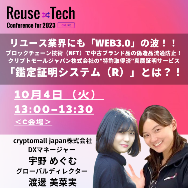 【Reuse×Tech Conference】リユース業界にもWeb3.0の波! クリプトモールジャパンがオンライン展示会にて特許取得済み「鑑定証明システム(R)」を利活用した「模倣品」対策をご紹介!