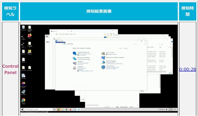 本ツールは、AIを用いた物体検出技術を利用して、本製品が取得した動画証跡に本来アクセスすべきではない特定の画面での操作等が含まれていないかどうかを自動で検出します。結果はレポートで出力され、検知した時点と該当部分の画像を確認できるため、動画証跡の監査・モニタリング業務の効率を向上させることが可能です(図を参照)。