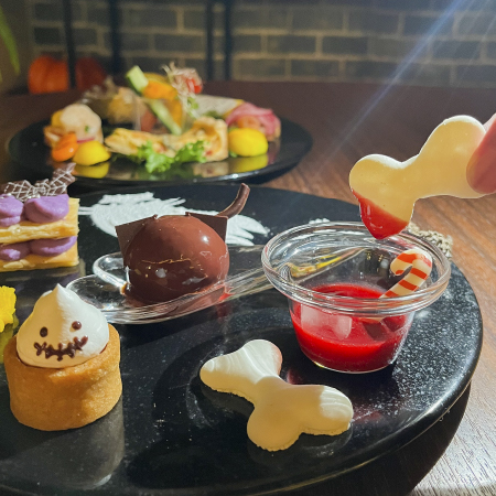 かわいらしいフォルムの★黒猫ムースや★ミニゴースト。★ホネホネマカロンはフランボワーズソースをつけていただきます。他にもかぼちゃや紫イモなどハロウィンテイスト満載のスイーツプレート。さらに、5種のライトミールプレート、ホテルパティシエが焼き上げる自家製スコーン3種の食べ放題(90分)、フリードリンク(90分)、乾杯ノンアルコールスパークリングワインがセットの盛りだくさんのアフタヌーンティーです。