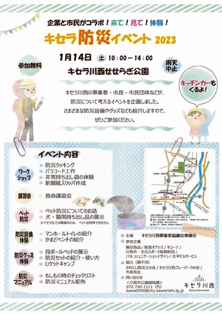 キセラ地区内の事業者連携の一環として、キセラ川西せせらぎ公園の防災設備の展示などをはじめとした、企業と市民がコラボレーションした市民向けの防災イベントで今回が2回目の開催となる。