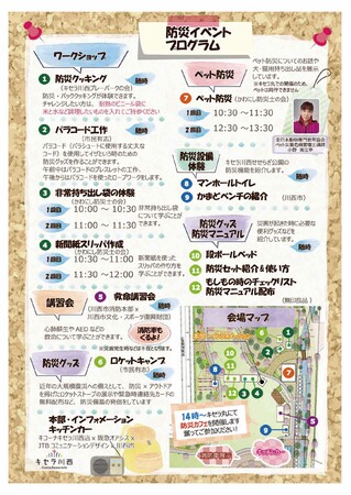 また、救命講習会では心肺蘇生やAEDについて学ぶことができるほか、キセラ丸ではペット防災のお話や犬・猫用持ち品の展示を行う。