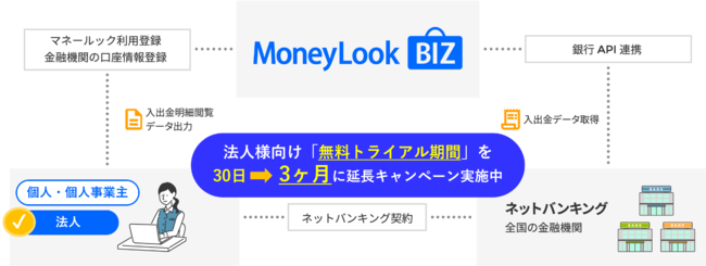 「MoneyLook」は、銀行や信用金庫、クレジットカード会社などの全国の金融機関のインターネット口座を一元管理できるだけでなく、会計システムや販売管理システム等のサービスへ入出金情報をAPI連携できる法人向け自動入出金明細取得サービスです。