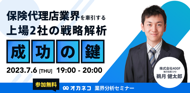 株式会社400F(フォーハンドレッド・エフ、本社:東京都中央区、代表取締役社長:中村 仁)は、2023年7月6日(木)19時より、保険代理店業界を牽引する2企業の戦略解析セミナーをオンラインにて開催いたします。