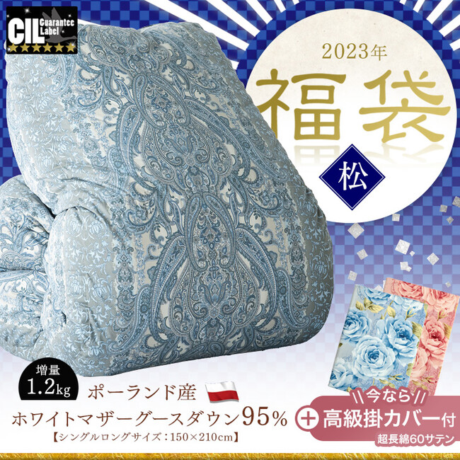 福袋では、この羽毛布団と福袋『松』と同じ高級カバーをセットにして販売しています。シングルサイズは69,999円(税込)での販売です。