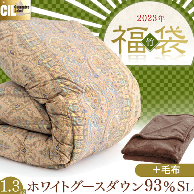 CILゴールドラベルを取得し、ホワイトグースダウンを93%使用した羽毛布団です。充填量は通常1.0kgのところこの羽毛布団は増量1.3kgタイプになっており、より暖かく、ふっくらとした羽毛布団になっています。さらに二層キルト仕上げることにより羽毛が偏りにくく、キルトの縫い目から空気が逃げにくいので保温力が高くなっています。福袋では毛布もセットにしてお届けします。