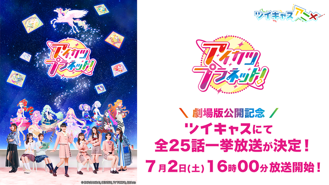 今回ツイキャスでは、アイカツ!シリーズ最新作のTVアニメ「アイカツプラネット!」全25話を11時間連続で一挙放送いたします。さらに、12話と13話の間には、「劇場版アイカツプラネット!」試写会映像を放送いたしますのでぜひTVアニメ本編と合わせてお楽しみください。