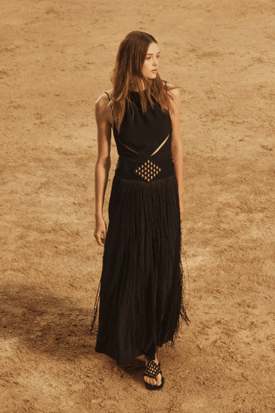 ボヘミアンと未来が交差するようなスタイルを実現するグラディエーターサンダル、彫刻的なフォルムのバッグ、流れるようなシルエットでありながら構築的なドレス、そして抽象的でアヴァンギャルドな装飾を施した重ね付けのジュエリーが登場。風に揺れるベルト付きのサマードレスは繊細なフローラル柄で、スポーツウェアを思わせる意外性のあるネックラインを採用しています。ストラップ付きのブラトップ、贅沢なプリーツドレス、テーラード仕立てのウエストコート、マイクロショーツ、そしてボリューム感のあるフルスリーブのブラウスが、アースカラーを基調としたナチュラルで上品なパレットで展開。さらに、染色による奥行きのある色彩と、時を超えて愛されるペイズリー柄が、コレクションに豊かな表情を添えます。