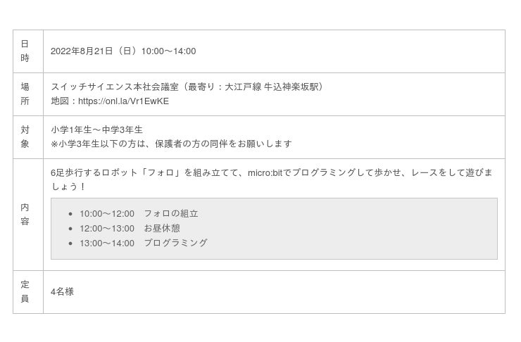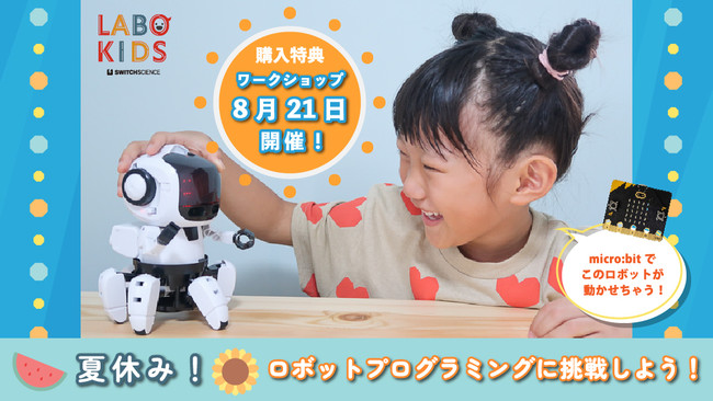 プログラミング学習を応援する子供向けウェブショップ「LABO KIDS(ラボキッズ、URL:https://labo-kids.com/」は、「micro:bit(マイクロビット)で動くプログラミング・フォロ」を購入された方を対象に、2022年8月21日(日)に開催するスイッチエデュケーションの「プログラミングワークショップ」に無料招待する夏休みキャンペーンを実施します。キャンペーン実施期間は2022年7月25日〜2022年8月18日です。