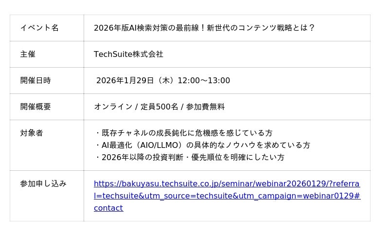 TechSuite株式会社(テックスイート/代表取締役: 畠山夏輝)は、2026年1月29日(木)に共催ウェビナー「2026年版AI検索対策の最前線!新世代のコンテンツ戦略とは?」を開催します。