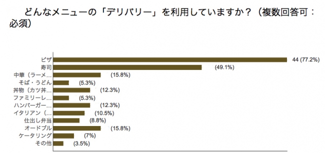 利用経験のあるデリバリー1位は「ピザ」が77.2%、次いで「寿司」が49.1%と圧倒的。普段から馴染みのあるデリバリーと言えば、この二強という結果に。他の意見では「中華(ラーメン・定食など)」と「オードブル」が15.8%。「丼物(カツ丼・天丼など)」と「ハンバーガーなどのファーストフード」が12.3%となりました。