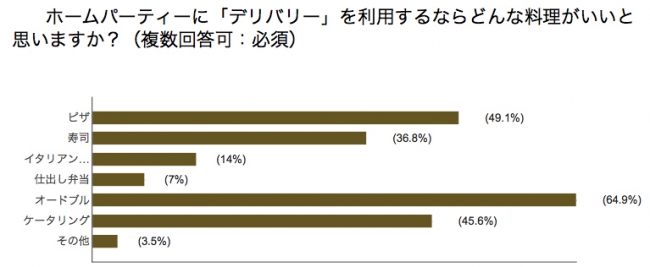 しかし、“ホームパーティー”でデリバリーを利用する場合となると結果に変化が。「オードブル」64.9%。次いで「ピザ」49.1%、「ケータリング」45.6%。ホームパーティー時には様々な料理を楽しめる方が好まれるようです。