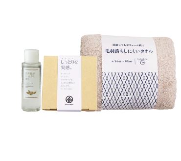 グループで共同開発したオーガニックホホバオイルをふんだんに使用した石鹸と、肌や髪、全身に使えて潤いを与えるホホバオイル、ハンドタオルのセットです。
