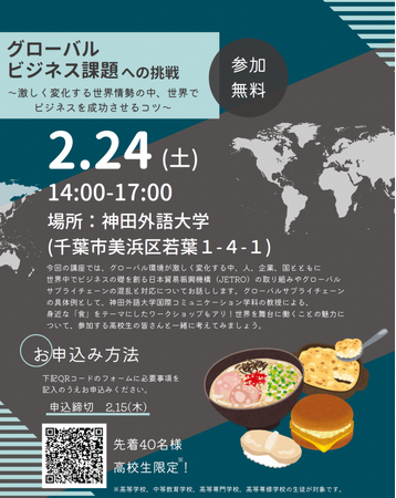神田外語大学(千葉市美浜区/学長:宮内孝久)を含む千葉市内に拠点を置く企業と大学および千葉市が産学官で連携し、高校生向けビジネス講座「幕張新都心ビジネススクール」を2月24日(土)に本学にて開講します。9回目となる今回は「グローバルビジネス課題への挑戦」と題し、人、企業、国とともに世界中でビジネスの礎を創る日本貿易振興機構(JETRO)の取り組みについて学ぶと同時に、本学の外国語学部国際コミュニケーション学科の鶴岡公幸教授による、身近な「食」をテーマにしたワークショップを開催します。グローバルビジネスの現場で直面する課題について学び、理解を深める絶好の機会です。高校生を対象としたこの無料講座は、産業界、学界、そして公的機関が連携することで、実践的な学びの場を提供します。専用サイト:https://www.city.chiba.jp/keizainosei/keizai/koyosuishin/makuhari-business-school2023.html