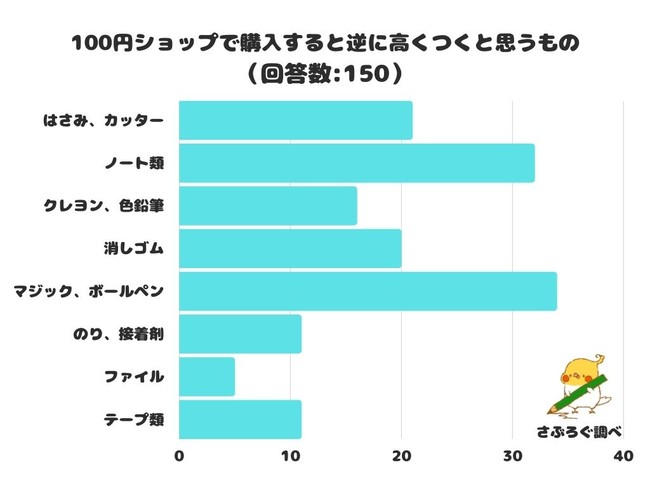 100円ショップで購入すると逆に高くつくと思うものをアンケートにて調査したところ、1位は「マジック、ボールペン」でした。