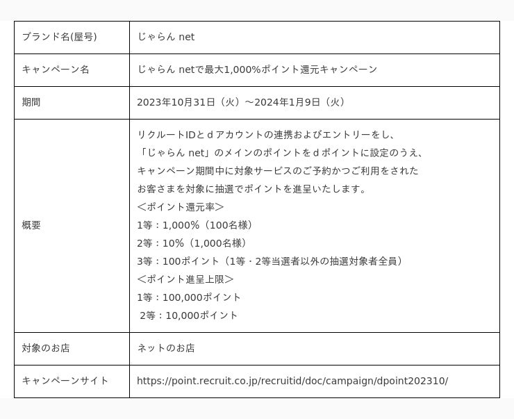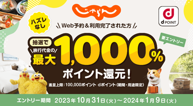 株式会社NTTドコモ(以下、ドコモ)は、株式会社リクルートの運営するサービス「じゃらん net」において、参加条件を満たしたお客さまを対象に、抽選で旅行代金の最大1,000%分のポイント(※1)を進呈する「じゃらん netで最大1,000%ポイント還元キャンペーン」(以下、本キャンペーン)を2023年10月31日(火)から2024年1月9日(火)までの期間で開催いたします。