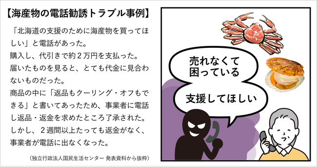 独立行政法人国民生活センター発表「海産物の電話勧誘トラブル 年末にかけて特に注意してください!」(https://www.kokusen.go.jp/news/data/n-20231108_1.html)