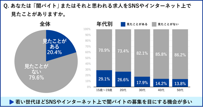 トビラシステムズが行った意識調査で、闇バイトまたはそれと思われる求人をSNSやインターネット上で見たことがある人は、15歳〜19歳で29.1%、20代で26.6%となりました。10代・20代は全体平均よりも割合が高く、若年層ほどSNSやインターネット上で闇バイトの求人を目にしている機会が多いといえます。