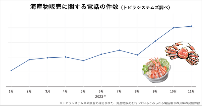 トビラシステムズの調査では、海産物販売に関する電話が増加傾向にあります。特に、ALPS処理水海洋放出が開始された2023年8月以降大きく増加しています。