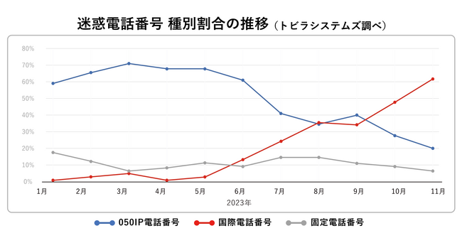 国際電話番号を利用した特殊詐欺が引き続き増加しています。トビラシステムズの調査で、2023年11月に新たに確認された迷惑電話番号の種別割合は、国際電話番号の割合が62.2%に上りました。2023年上半期に最も多かったIP電話番号(050番号)の割合は、下半期に入り減少傾向にあります。