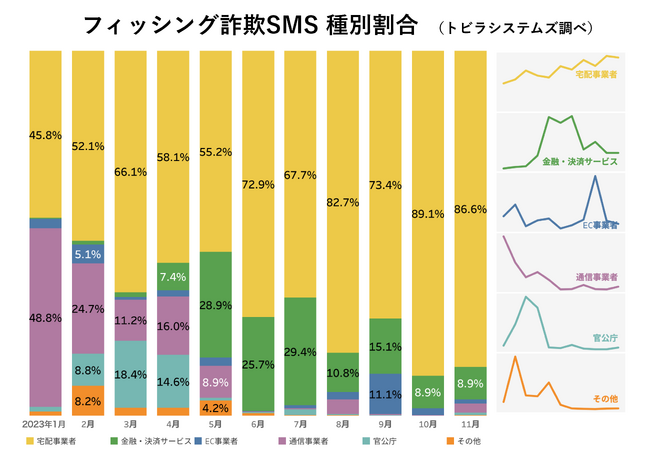 トビラシステムズの調査で、2023年11月に確認されたフィッシング詐欺のSMSの種別割合は、宅配事業者をかたる手口が86.6%を占めました。