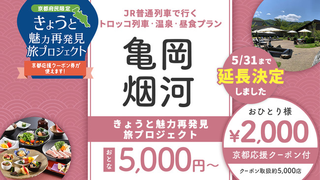 株式会社フォーティーズ(本社:大阪市鶴見区、代表取締役 岡武史)は5月31日迄延長になった「きょうと魅力再発見旅プロジェクト」の対象商品として里山リゾート 烟河(けぶりかわ)で創作ランチ+入浴+トロッコ列車+保津川下り+往復JRがセットになったパックツアーのオンライン販売を開始しました。