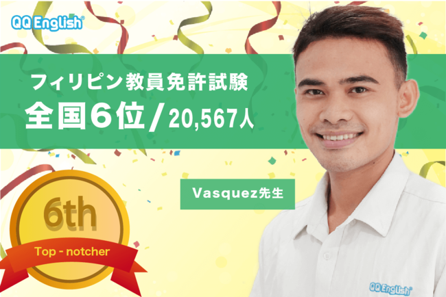 その試験においてQQ Englishの教師である、Vasquez先生はフィリピン全国6位の成績を納めました。