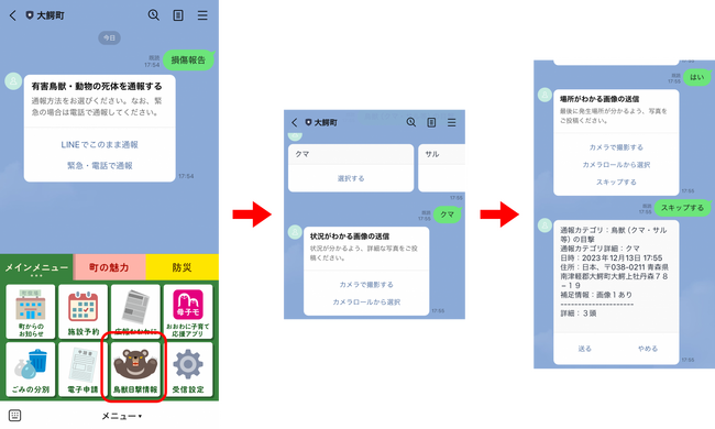住民から鳥獣などの目撃情報を連絡できる「通報機能」を導入。ユーザーはチャットボットの案内に従い、現場の写真や位置、詳細情報を送ることで通報することが可能です。