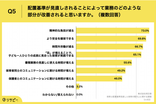 Q4で「非常にそう思う」「ややそう思う」と回答した方に、「Q5.配置基準が見直しされることによって業務のどのような部分が改善されると思いますか。(複数回答)」(n=63)と質問したところ、「精神的な負担が減る」が73.0%、「より安全を確保できる」が69.8%、「時間外労働が減る」が66.7%という回答となりました。