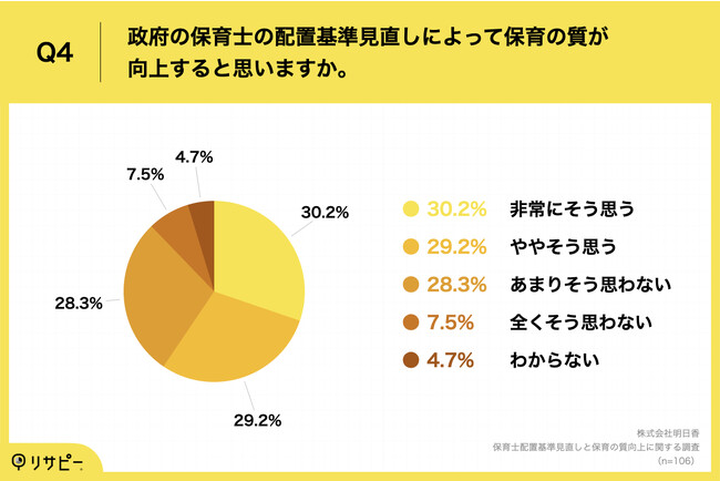「Q4.政府の保育士の配置基準見直しによって保育の質が向上すると思いますか。」(n=106)と質問したところ、「非常にそう思う」が30.2%、「ややそう思う」が29.2%という回答となりました。