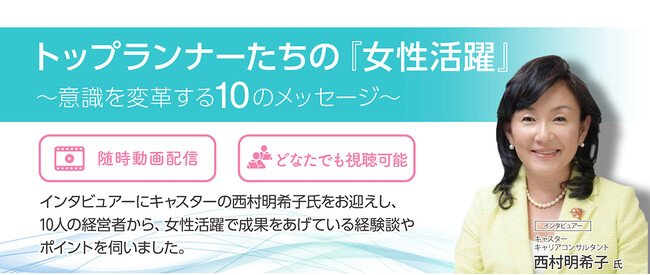 トップランナーたちの『女性活躍』〜意識を変革する10のメッセージ〜では、インタビュアーにキャスターの西村明希子氏をお迎えし、10人の経営者等から女性活躍で成果をあげている経験談やポイントを伺います。女性活躍の視点から、実体験に基づいた経営戦略のヒントをお届けするコンテンツです。