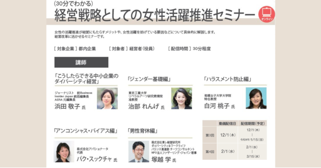 【1/15(日)第3回配信終了】1本あたり30分! 自由な時間に経営改革に活かせる『(30分でわかる)経営戦略としての女性活躍推進セミナー』