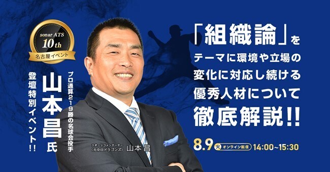 Thinkings株式会社(シンキングス、本社:東京都中央区、代表取締役社長:吉田 崇)が提供する採用管理システム「sonar ATS」は、2022年8月9日(火)に、プロ通算219勝の名球会 元中日ドラゴンズ投手で、スポーツコメンテーターの山本 昌氏を迎え、sonar ATS10周年を記念した人事・採用担当者向けの特別イベントをオンライン配信にて開催します。