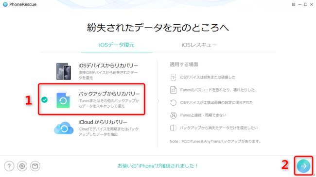 1. PhoneRescueを起動し、「バックアップからリカバリー」を選択します。