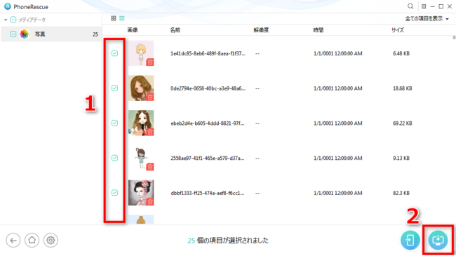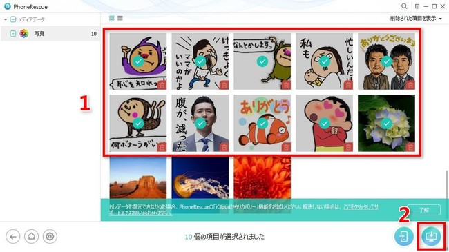 Step3:削除されたデータを選び、デバイスへまたはパソコンへボタンをクリックし復元します。