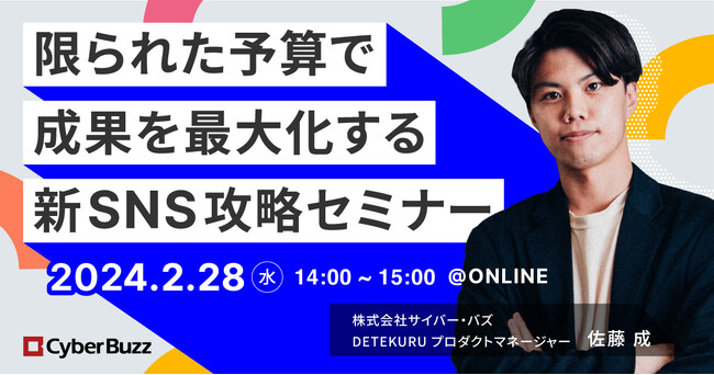 ソーシャルメディアマーケティング事業を展開する株式会社サイバー・バズ(本社:東京都渋谷区、代表取締役社長:高村 彰典)は、2023年7月にローンチした企業とクリエイターのマッチングプラットフォーム「DETEKURU」より、「限られた予算で成果を最大化する新SNS攻略セミナー」を2月28日(水)14時〜開催いたします。
