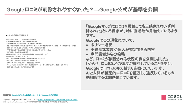 Google口コミの削除相次ぐ / アマゾン「やらせレビュー」の実態:Googleマップ・口コミ関連最新情報レポート【2022年6月版】を店舗支援SaaS「口コミコム」運営のmovが公開