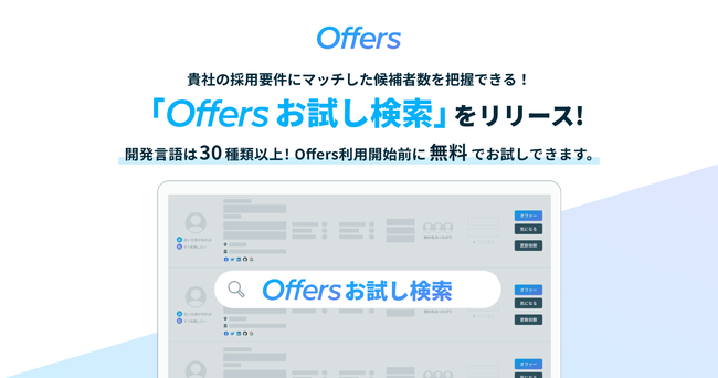 企業の採用要件に合ったOffers登録者数が一目でわかる「Offersお試し検索」ページを公開しました。本機能の活用により、Offersをご利用いただいていない企業様でも、採用要件にマッチするOffers登録者数や、採用までの目安となる期間などの情報がわかるようになります。