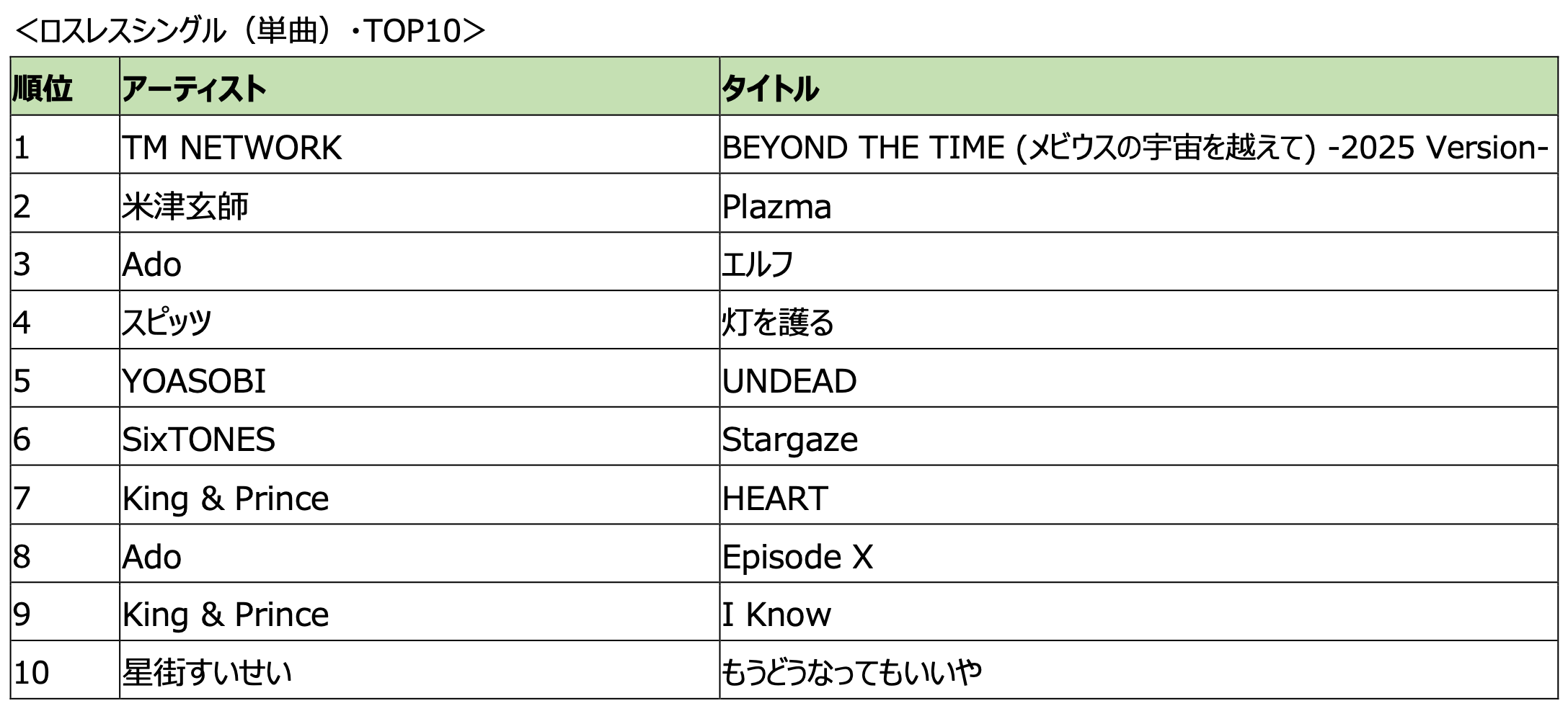 ●ロスレス部門では、『機動戦士Gundam GQuuuuuuX(ジークアクス)』第11話の挿入歌であるTM NETWORK「BEYOND THE TIME (メビウスの宇宙を越えて) -2025 Version-」が、シングル(単曲)/アルバム(まとめ買い)ともに1位を獲得するという快挙を成し遂げました。シングル(単曲)部門で見ると、総合シングル(単曲)部門1位の米津玄師「Plazma」がロスレスシングル(単曲)部門でも2位を獲得。3位にはTBS系ドラマ『クジャクのダンス、誰が見た?』主題歌のAdo「エルフ」、4位はTVアニメ『SPY×FAMILY』Season 3オープニング主題歌のスピッツ「灯を護る」、といった面々が顔を揃えました。