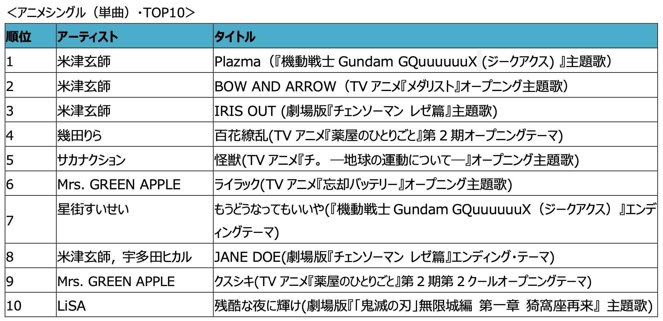 ●アニメシングル(単曲)部門では、米津玄師がTOP3を独占。1位は今年アニメ、映画ともに話題となった『機動戦士Gundam GQuuuuuuX (ジークアクス) 』主題歌である「Plazma」、2位にはTVアニメ『メダリスト』オープニング主題歌の「BOW AND ARROW」、3位には劇場版『チェンソーマン レゼ篇』主題歌の「IRIS OUT」がランクインし、圧倒的な人気を誇っています。