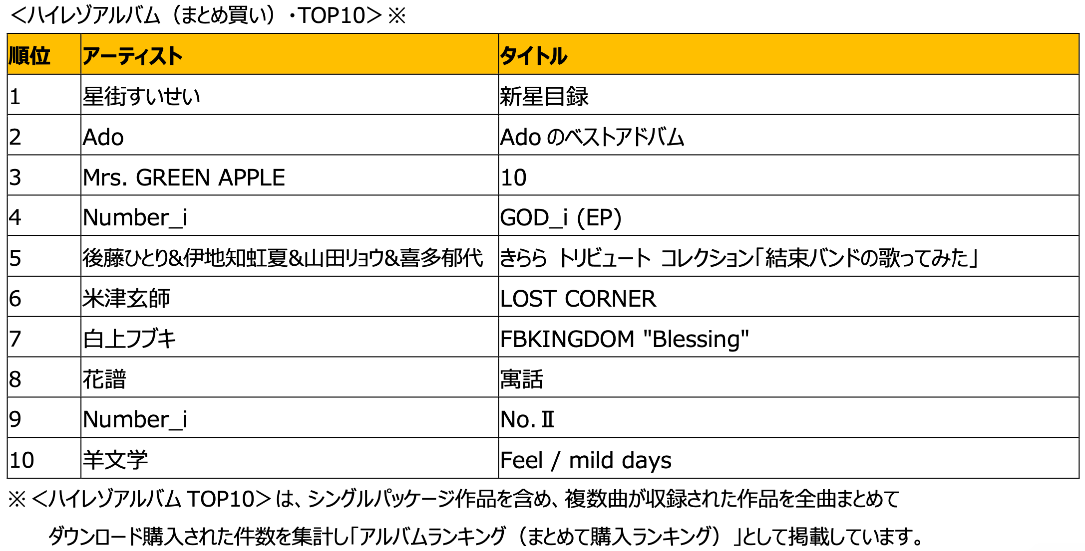 ●総合アルバム(まとめ買い)部門では、3位にMrs. GREEN APPLEのデビュー10周年記念ベストアルバム「10」がランクイン。そのほか、Adoの初ベストアルバム、サザンオールスターズ10年ぶりのオリジナルアルバムなどがランクインし、今年の音楽シーンを彩っています。
