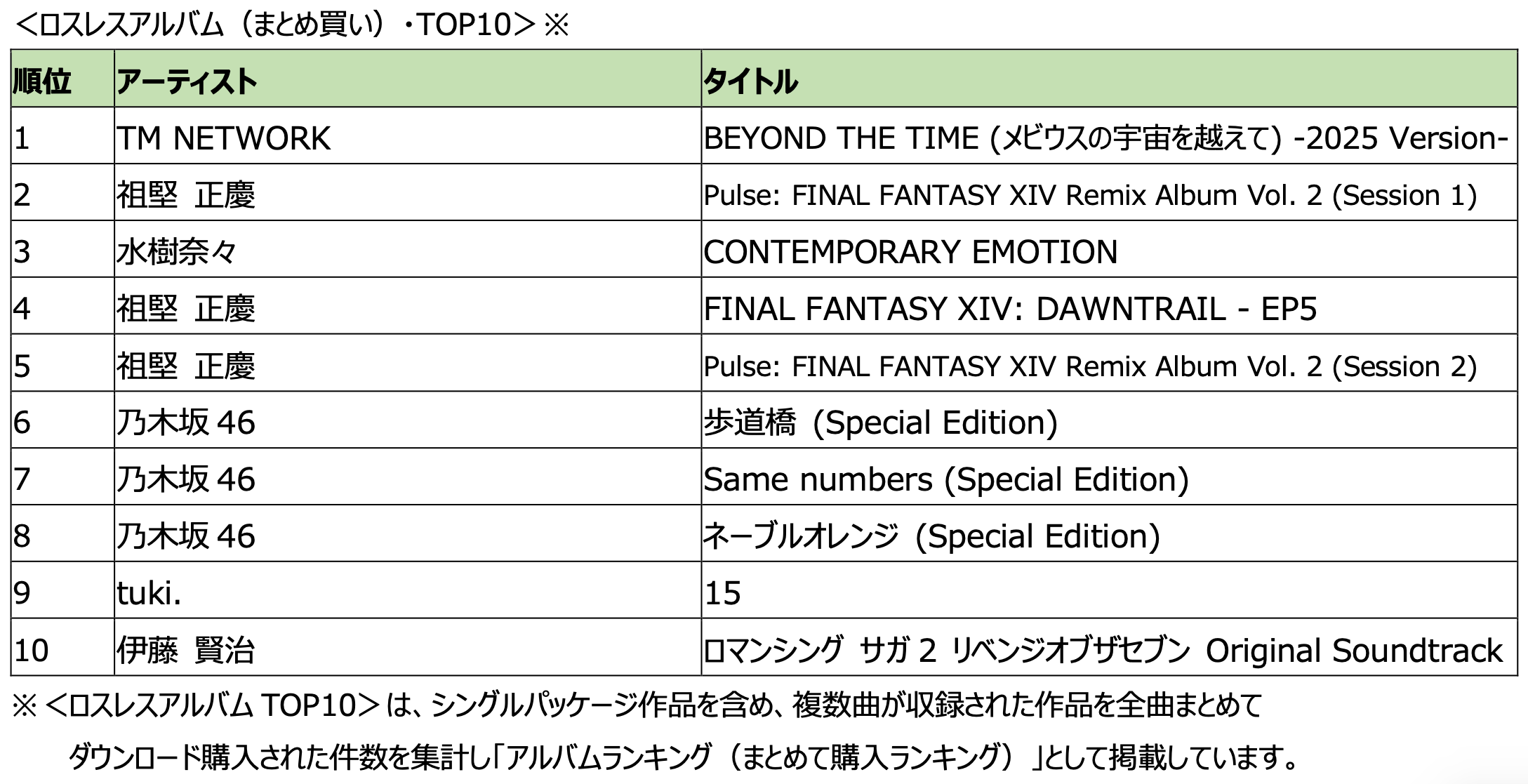 ●ロスレス部門では、TM NETWORK「BEYOND THE TIME (メビウスの宇宙を越えて) -2025 Version-」がシングル部門/アルバム部門ともに1位に輝きました。