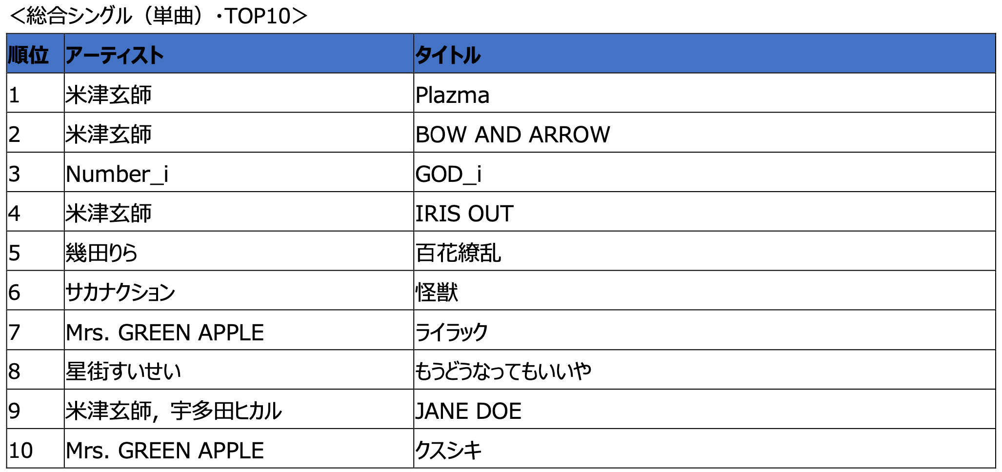 さらに総合シングル(単曲)部門TOP10でみると、2位「BOW AND ARROW」、4位「IRIS OUT」、9位に宇多田ヒカルとのコラボレーション作品「JANE DOE」と、合わせて4作品がランクインする結果となり、今年の音楽チャートを盛り上げました。