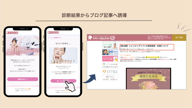 中間:キャンペーンなどで今後もガチャは活用していく予定です。また、患者様のお悩みに合ったメニュー例を提案できるように、診断アプリの作成も進めていきます。ホームページにアップしているブログ記事と「クロワッサン」の診断結果を紐づけることもできると伺ったので、患者様に記事をご覧いただいてから、来院につなげていく流れも前向きに検討していく予定です。