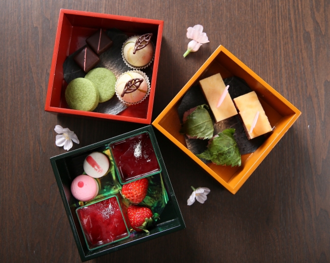デザートボックス(苺のレアチーズケーキ/桜餅/手鞠フロマージュポップ/西尾抹茶のサブレ/桜のボンボンショコラ/愛知県産いちご/季節のジュレ/マカロンチェリー)