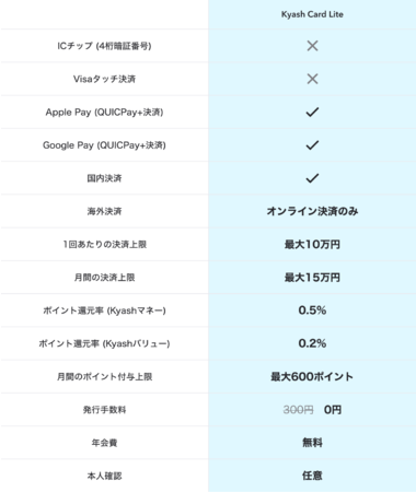 キャンペーン期間中は、世界中のVisa加盟店(海外はオンライン決済のみ)でお使いいただけるリアルカード「Kyash Card Lite」の発行手数料300円が“無料”となり、お得に発行いただけるようになります。